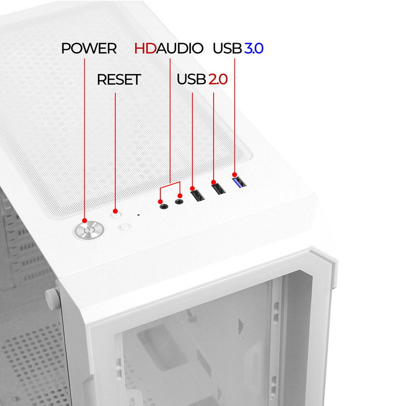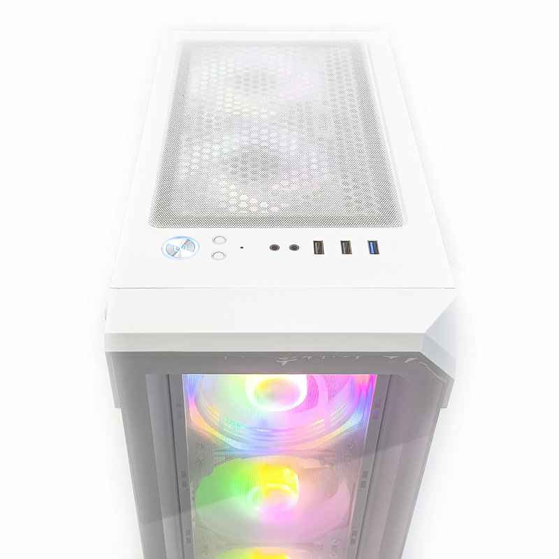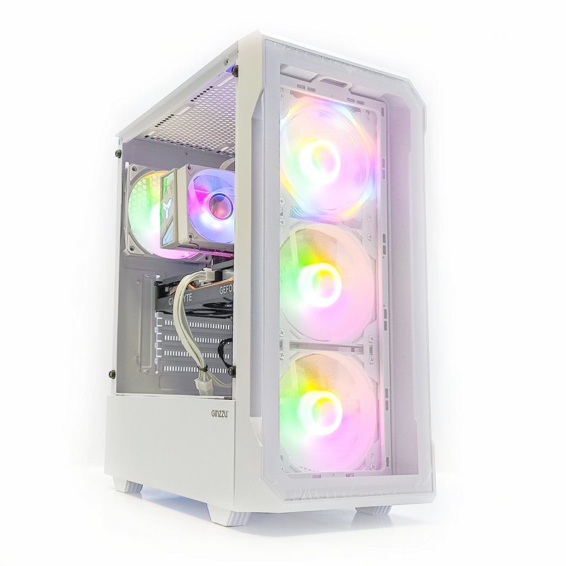 Все компоненты размещены в стильном корпусе Ginzzu CL130 белого цвета. Этот Mid Tower корпус изготовлен из стали толщиной 0,5 мм и поддерживает материнские платы форматов ATX, micro-ATX и mini-ITX. Особенность модели — панели из закаленного стекла спереди и сбоку, которые демонстрируют внутреннюю сборку и RGB-подсветку. Корпус предусматривает установку до восьми вентиляторов, систем жидкостного охлаждения с радиаторами до 240 мм, а также видеокарт длиной до 305 мм. Магнитные пылевые фильтры защищают от загрязнений, а продуманная система кабель-менеджмента упрощает сборку.