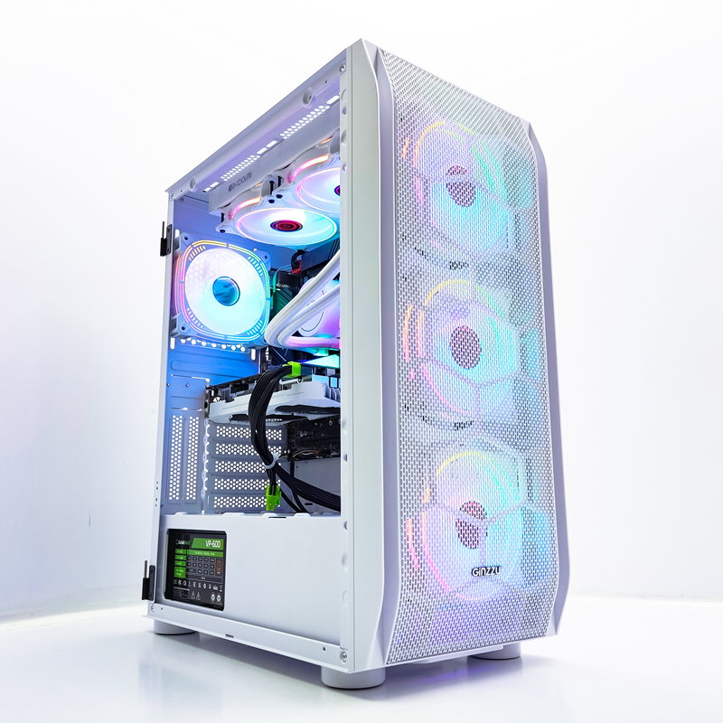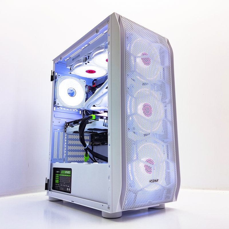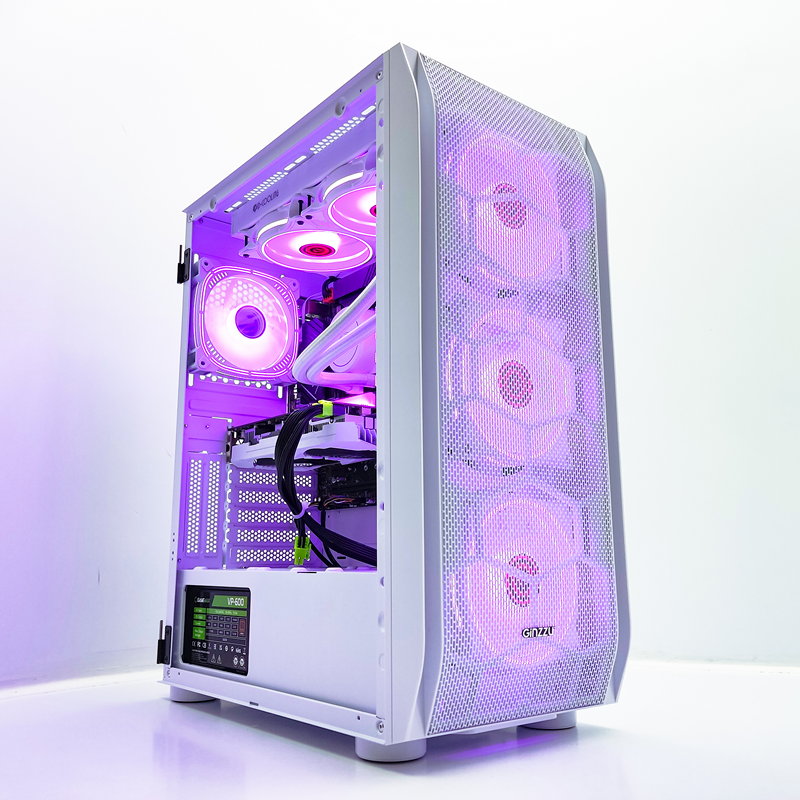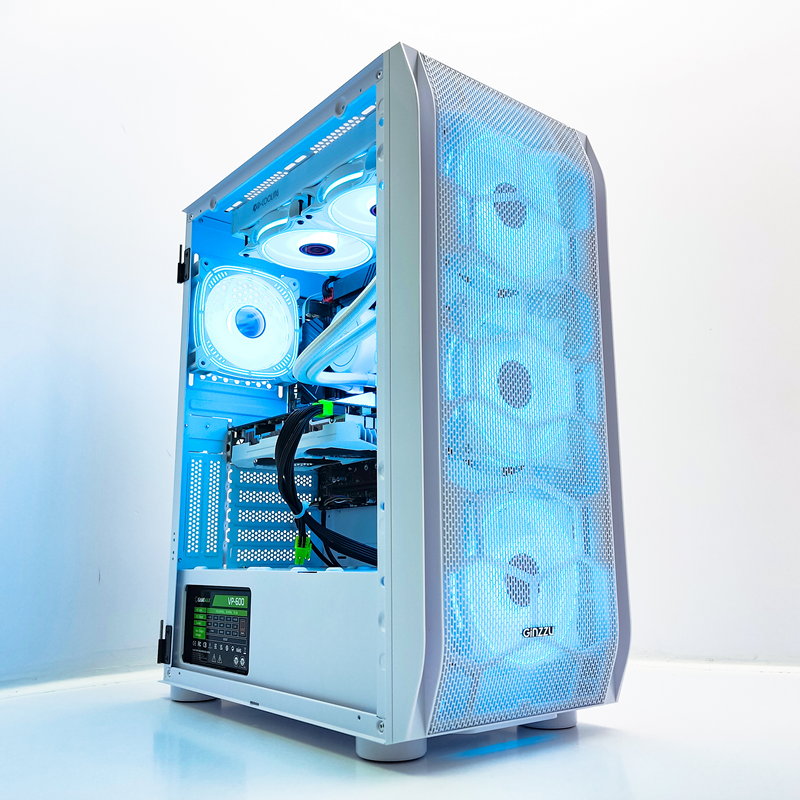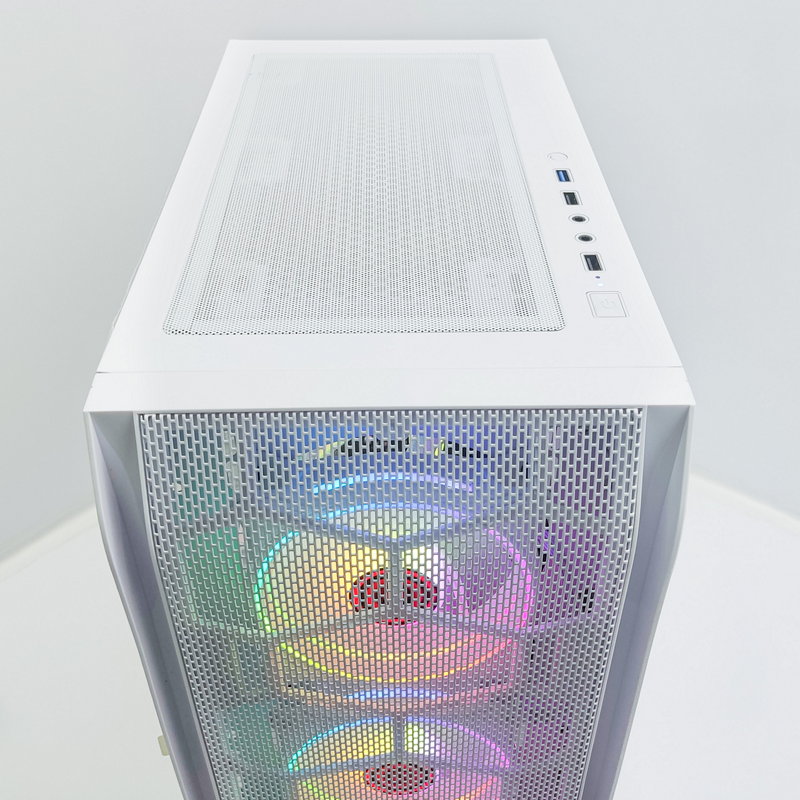 Цельностеклянная боковая дверь на петлях облегчает апгрейды. Шесть 120-мм вентиляторов с адресуемой RGB-подсветкой формируют фронтальный поток 75 CFM при 1,100 RPM, обеспечивая CPU и GPU свежим воздухом.