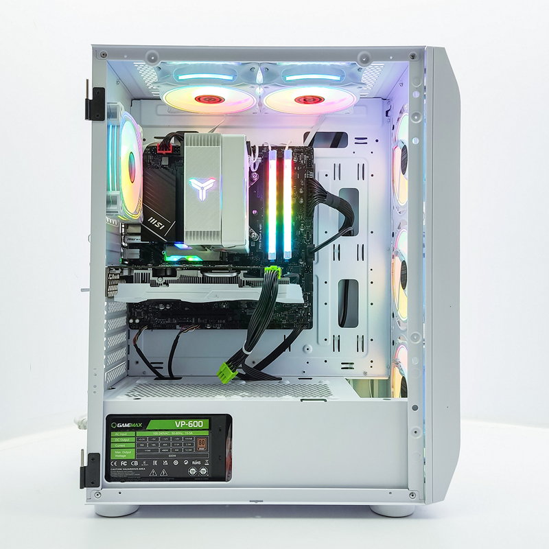 Башенная конструкция с четырьмя теплотрубками, белый радиатор и ARGB-вентилятор обеспечивают тихое охлаждение (≤26 dB) при нагрузке на Raptor Lake-процессоры.